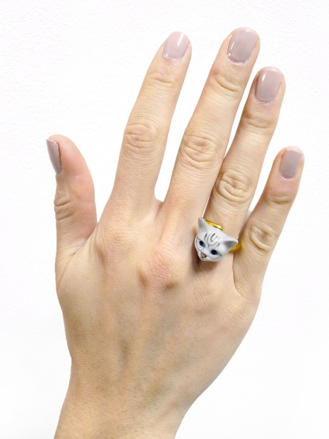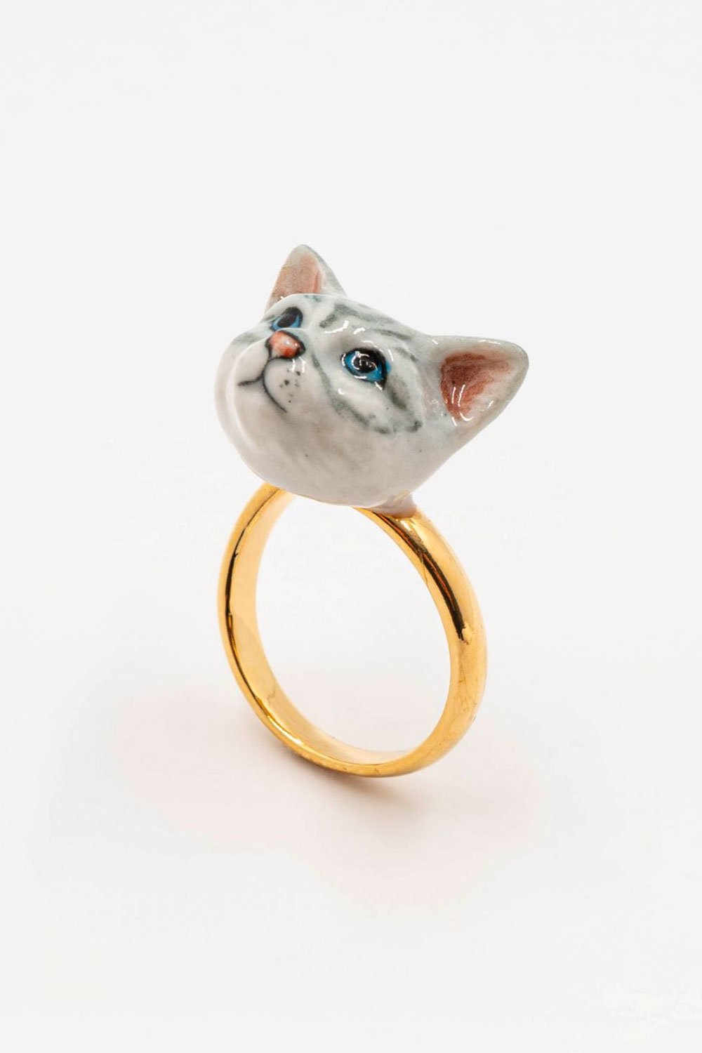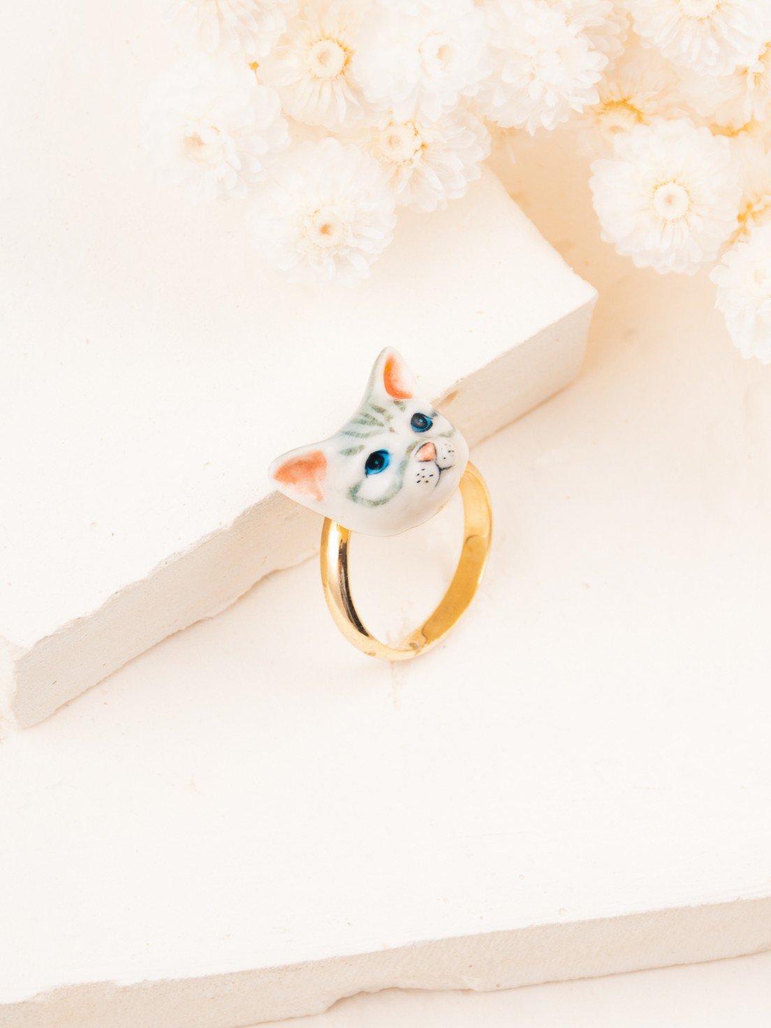 Cette jolie bague NACH est composée d’une tête de chat tabby en porcelaine et en laiton doré à l’or fin. La porcelaine est réalisée et peinte à la main ce qui rend les pièces NACH uniques !