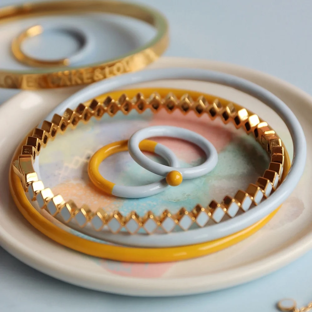 Chaque bague en émail est peinte à la main, ce qui peut provoquer de légères irrégularités ou variations de diamètre (~1 mm) et de couleur, ces petites différences font partie de l’authenticité et de la beauté de chaque bijou.