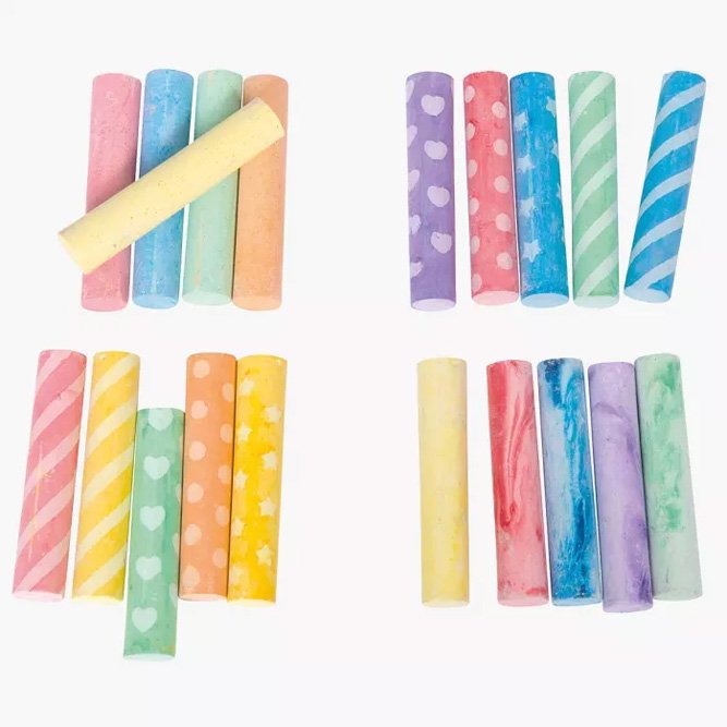 La boîte de 20 craies de sol est parfaite pour les amateurs de dessin ! Elle contient 20 craies de 6 couleurs à motifs géométriques, pailletées ou marbrées. Mis dans un petit seau, elles sont faciles à ranger et à transporter. À utiliser sur le sol ou les murs pour jouer à la marelle ou dessiner selon vos envies !