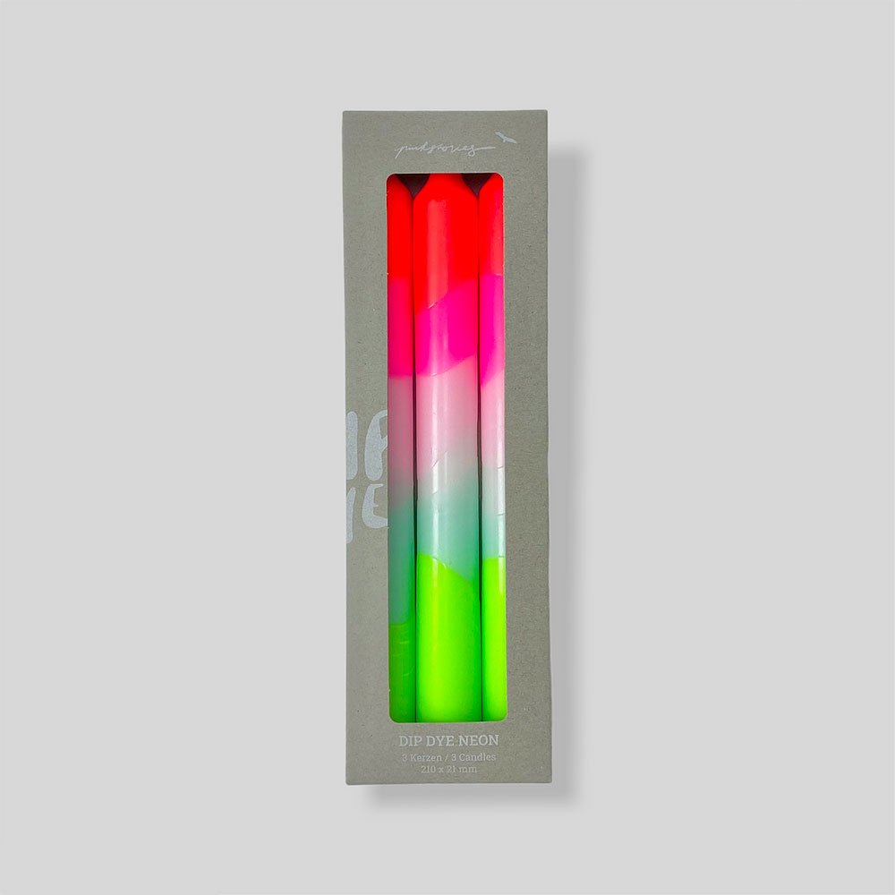 Ensemble de trois bougies joliment colorées à la main dans un look néon. Les couleurs sont les mêmes d’une bougie à l’autre mais les motifs varient, ce qui les rendent uniques !