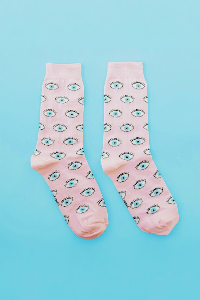 Si COUCOU SUZETTE a un emblème c’est bien l’oeil ! Ces chaussettes roses à fils de coton pailletés attirent tous les regards !