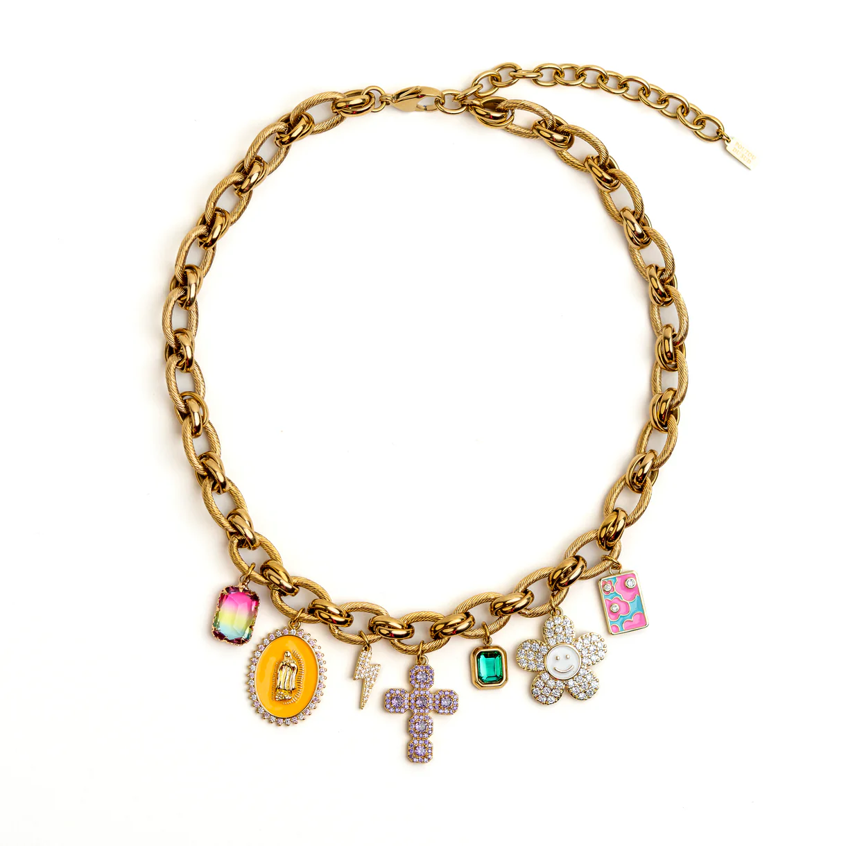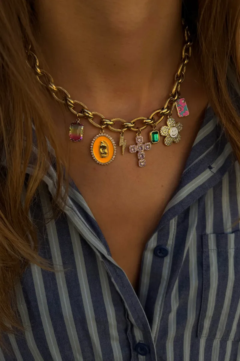 Apportez une touche de fun et de personnalité à vos tenues avec ce collier Mamy Grand en acier inoxydable et laiton doré à l’or fin. Orné de grigris et breloques pleins de charme, il se porte facilement au quotidien et s’accorde à toutes vos tenues. Léger, résistant et pensé pour durer, ce collier ajoute un détail décalé et joyeux à votre style, fidèle à l’esprit unique et audacieux de Mamy Grand.