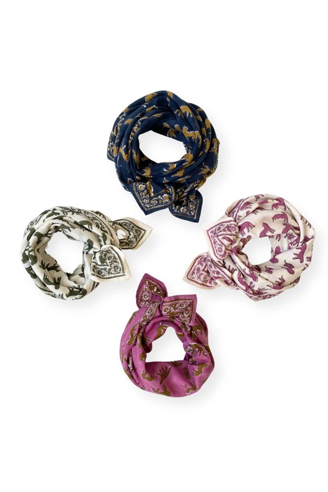 Ce joli foulard est confectionné de manière artisanale grâce à la technique indienne du block-print. Ses couleurs sont réalisées à partir de pigments naturels. Cette confection manuelle peut entraîner certaines “irrégularités” dont nous aimons le charme…