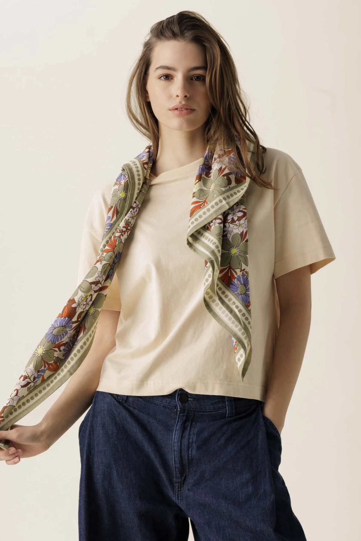 Ce joli foulard est confectionné de manière artisanale grâce à la technique indienne du block-print. Ses couleurs sont réalisées à partir de pigments naturels. Cette confection manuelle peut entraîner certaines “irrégularités” dont nous aimons le charme…