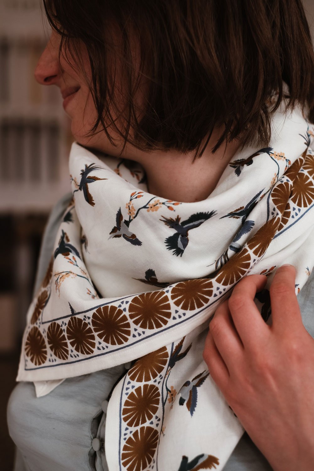 Ce joli foulard est confectionné de manière artisanale grâce à la technique indienne du block-print. Ses couleurs sont réalisées à partir de pigments naturels. Cette confection manuelle peut entraîner certaines “irrégularités” dont nous aimons le charme…