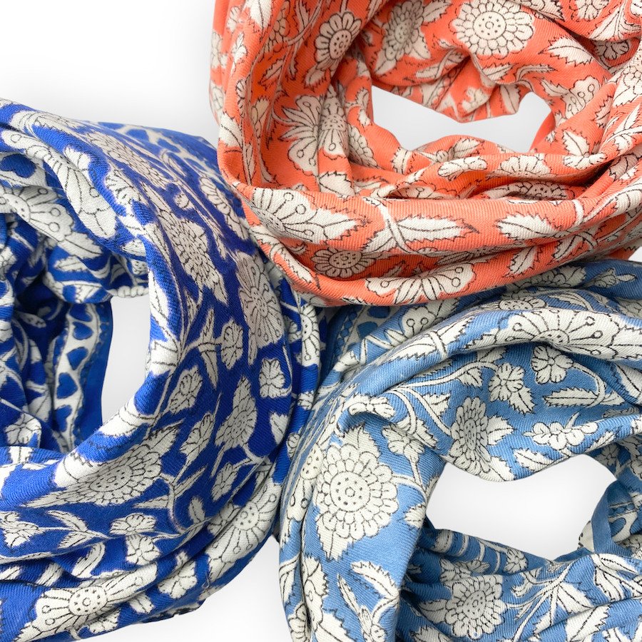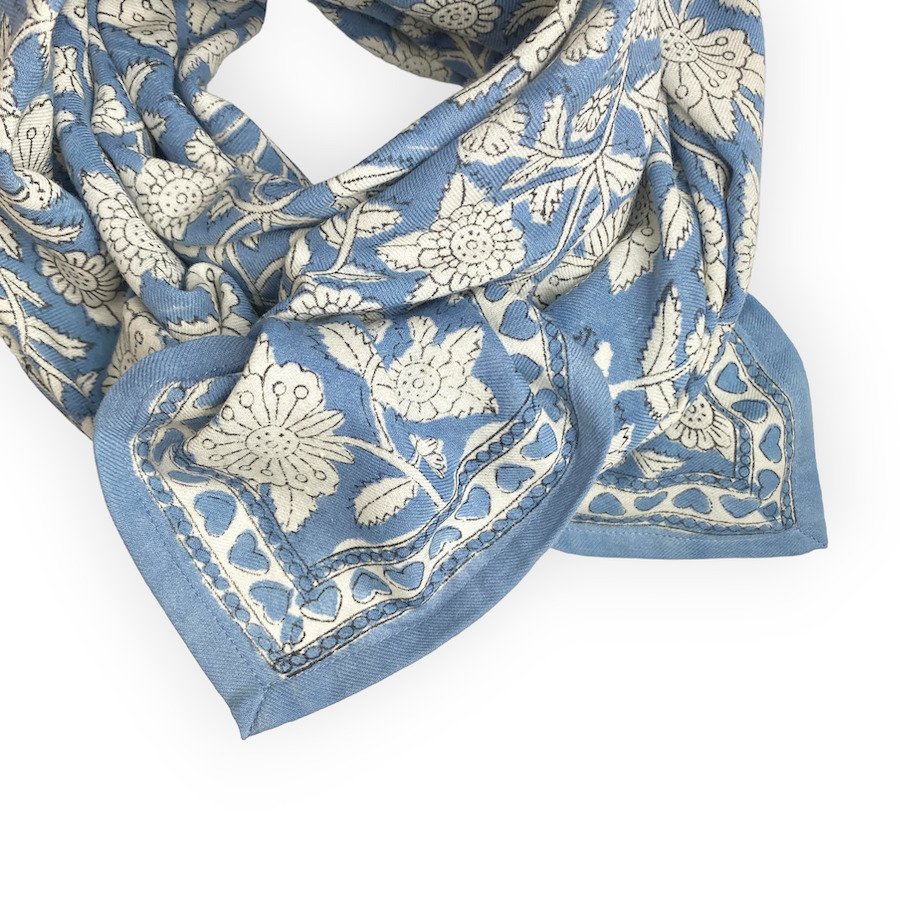 Ce joli foulard est confectionné de manière artisanale grâce à la technique indienne du block-print. Ses couleurs sont réalisées à partir de pigments naturels. Cette confection manuelle peut entraîner certaines “irrégularités” dont nous aimons le charme…