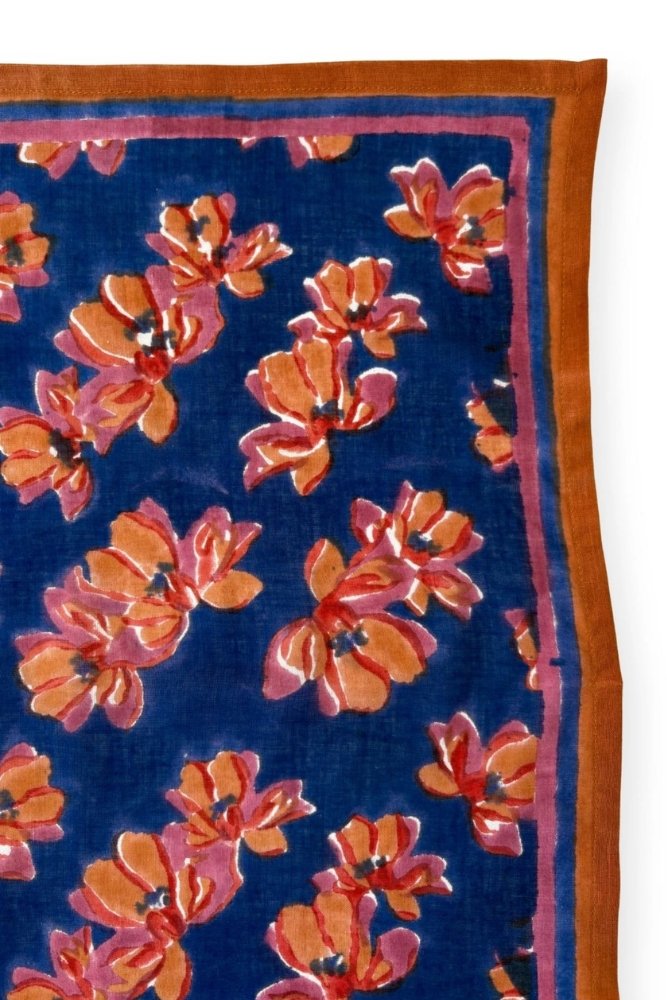 Ce joli foulard est confectionné de manière artisanale grâce à la technique indienne du block-print. Ses couleurs sont réalisées à partir de pigments naturels. Cette confection manuelle peut entraîner certaines “irrégularités” dont nous aimons le charme…