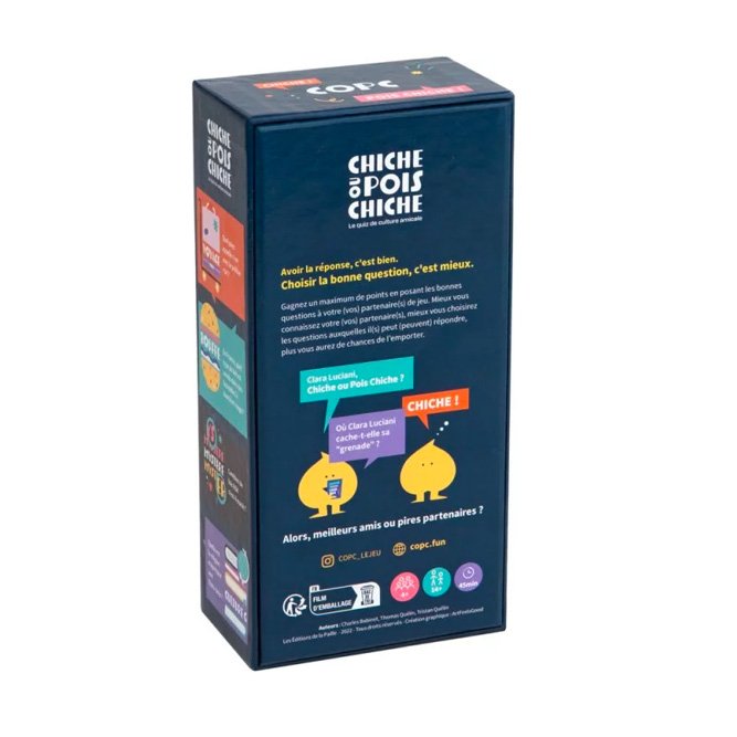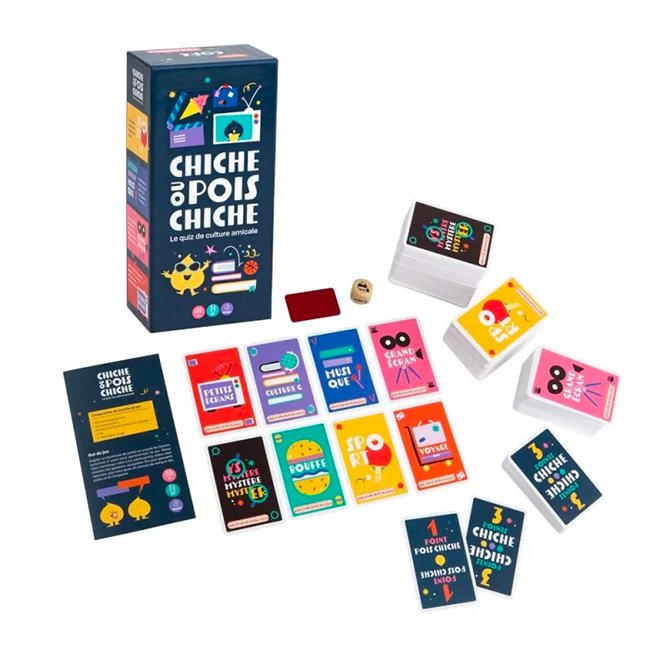 Le jeu d’ambiance ‘Chiche ou pois chiche’ consiste à poser les questions auxquelles votre ou vos partenaires de jeu peuvent répondre pour remporter un maximum de points.