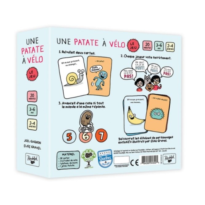 Chaque tour, piochez une carte patate et une carte vélo. Lisez ensuite l’association formée comme par exemple « [Est-ce que ça se peut une licorne…] […qui pète?] ». Votez ensuite avec vos tuiles de votes. Si tout le monde a choisi la même tuile, la patate avance d’une case. Sinon, elle reste sur place.