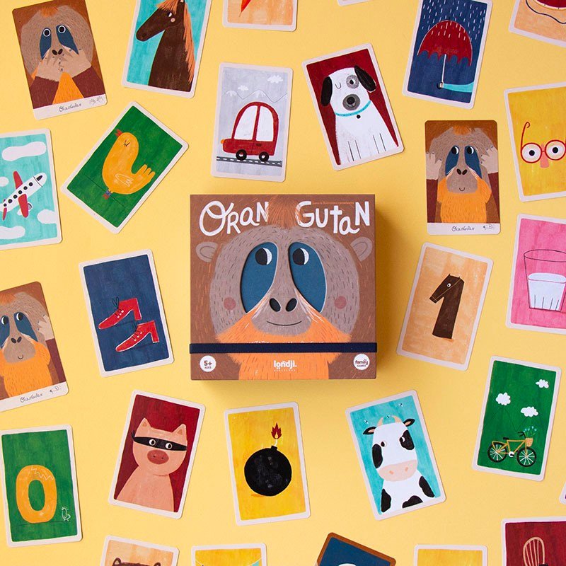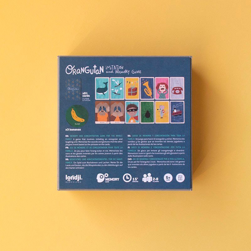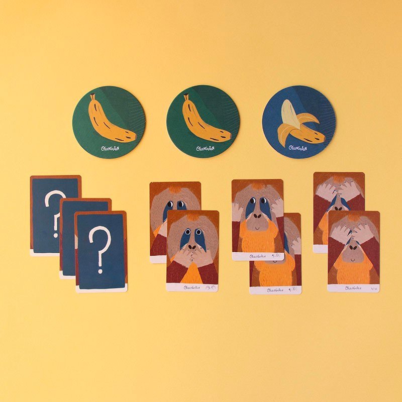 Cet amusant jeu de carte à mémoire a été conçu pour toute la famille. Souvenez-vous de la séquence de sons et de gestes élaborée par l’ensemble des joueurs à partir des images présentes sur les cartes à jouer. Trouvez les 3 orangs-outans avant que les bananes ne soient épuisées !
