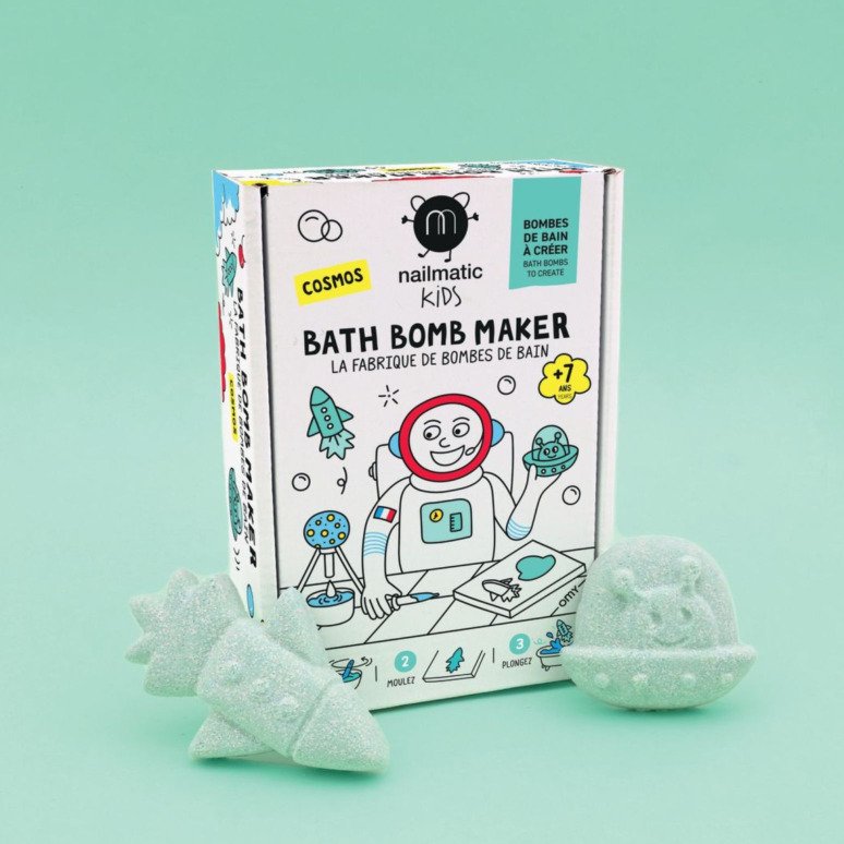 Avec la fabrique de bombes de bain NAILMATIC, les enfants peuvent créer 2 bombes de bain en forme de fusée et de soucoupe volante. Comment ça marche ? Facile : on mélange, on ajoute un peu d’eau, on re-mélange et on moule !