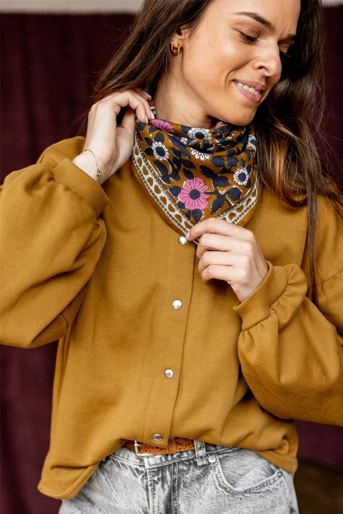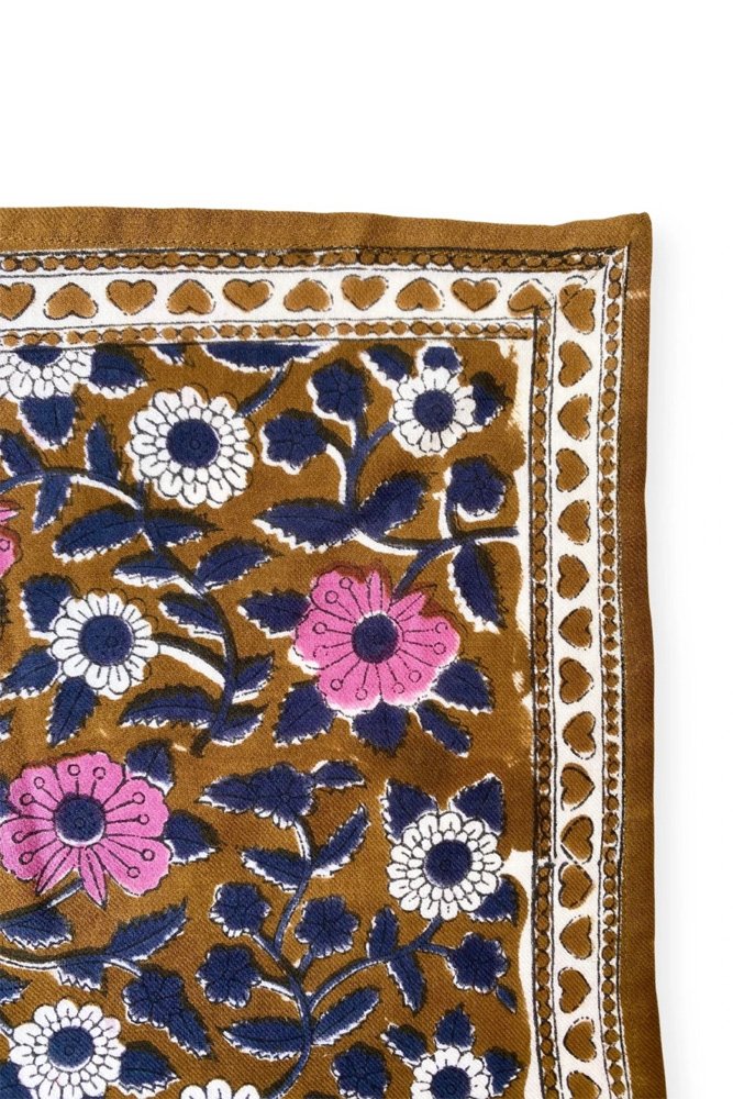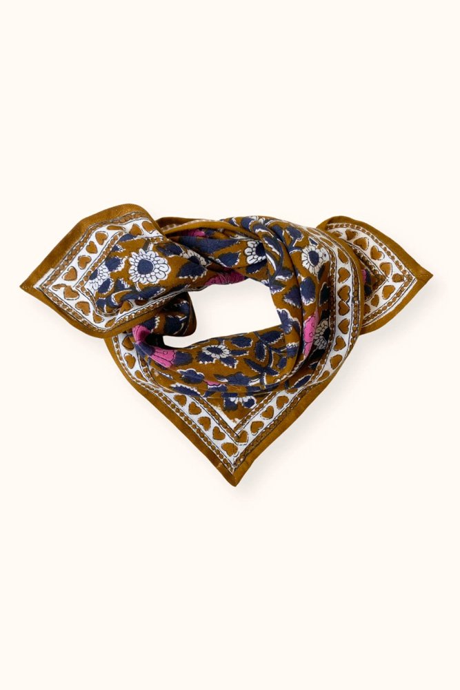 Ce joli foulard est confectionné de manière artisanale grâce à la technique indienne du block-print. Ses couleurs sont réalisées à partir de pigments naturels. Cette confection manuelle peut entraîner certaines “irrégularités” dont nous aimons le charme…
