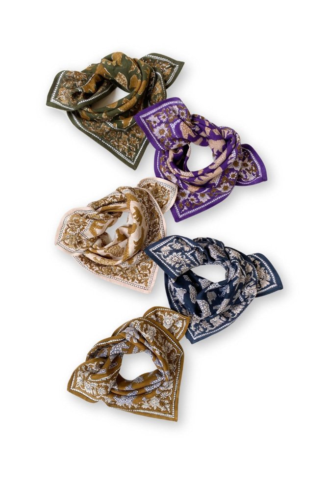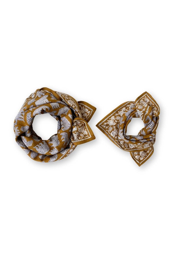 Ce joli foulard est confectionné de manière artisanale grâce à la technique indienne du block-print. Ses couleurs sont réalisées à partir de pigments naturels. Cette confection manuelle peut entraîner certaines “irrégularités” dont nous aimons le charme…