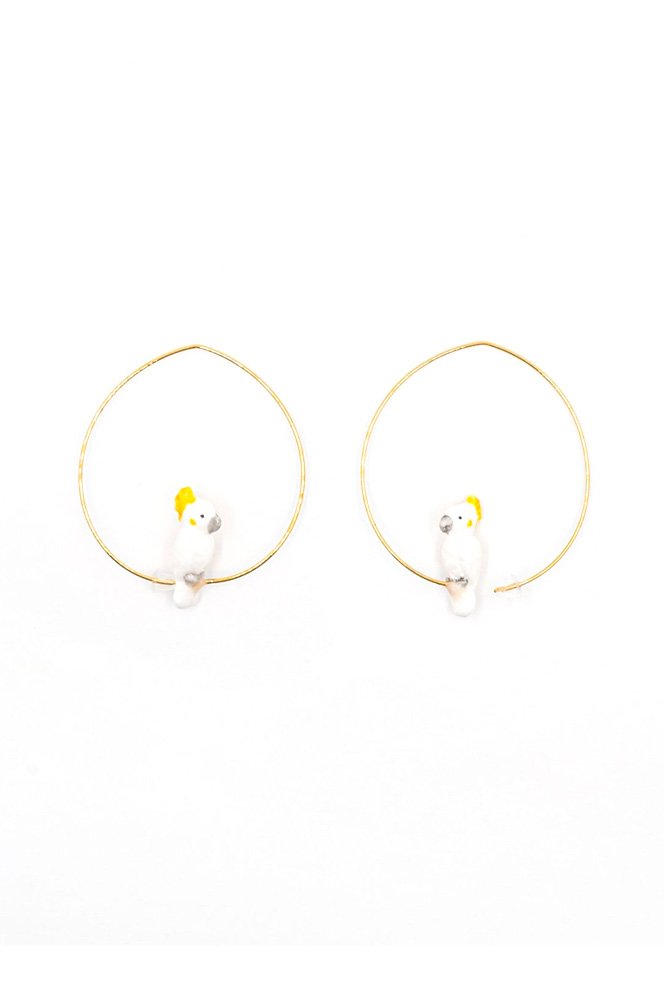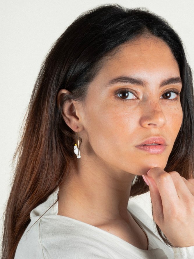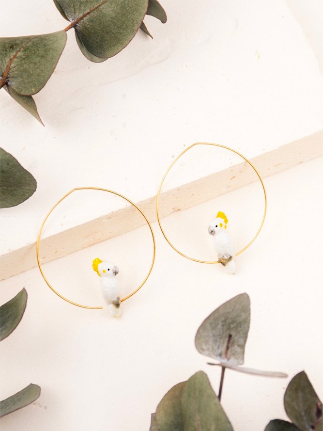 Cette paire de créoles NACH est composée de petits cacatoès en porcelaine, et de créoles en laiton doré à l’or fin 24 carats. La porcelaine est réalisée et peinte à la main ce qui rend les pièces NACH uniques !