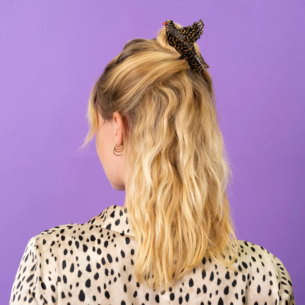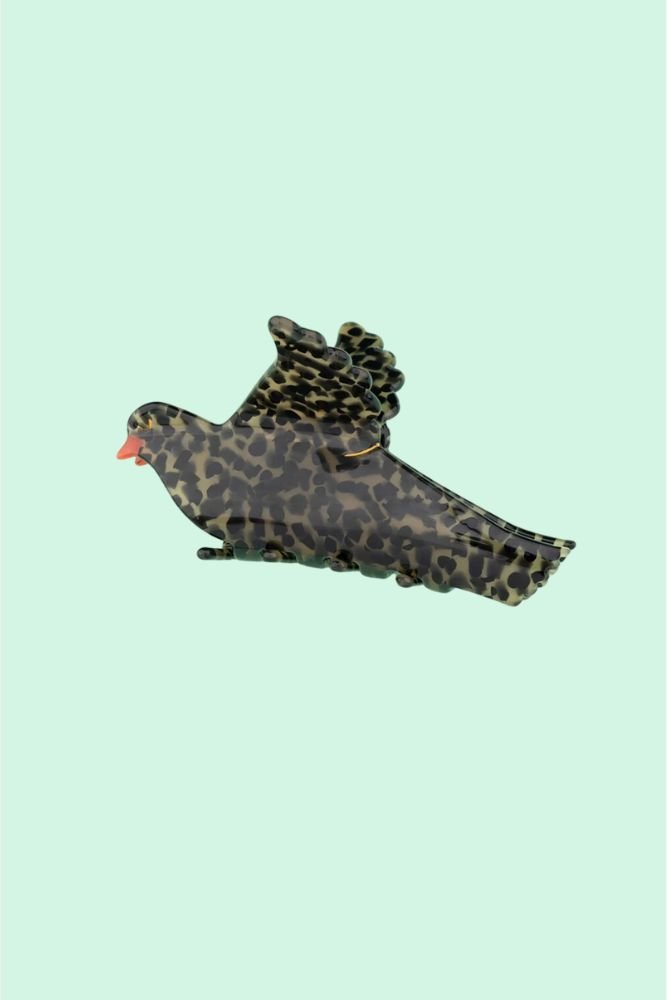 Cette pince à cheveux COUCOU SUZETTE prend la forme d’une grive, ce petit oiseau aux taches marron si caractéristiques. Fabriquée en acétate, elle imite à merveille son plumage.