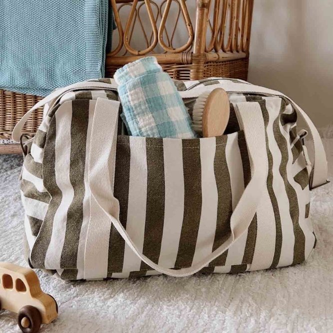 Ce sac servira aussi bien de sac à langer que de sac week-end ! Pratique, il est agrémenté de grandes poches intérieures et extérieures. On aime sa grande bandoulière et ses deux anses qui permettent de porter le sac de différentes façons. Et on aime aussi sa grande ouverture qui permet de retrouver facilement ses affaires ou celles de bébé.