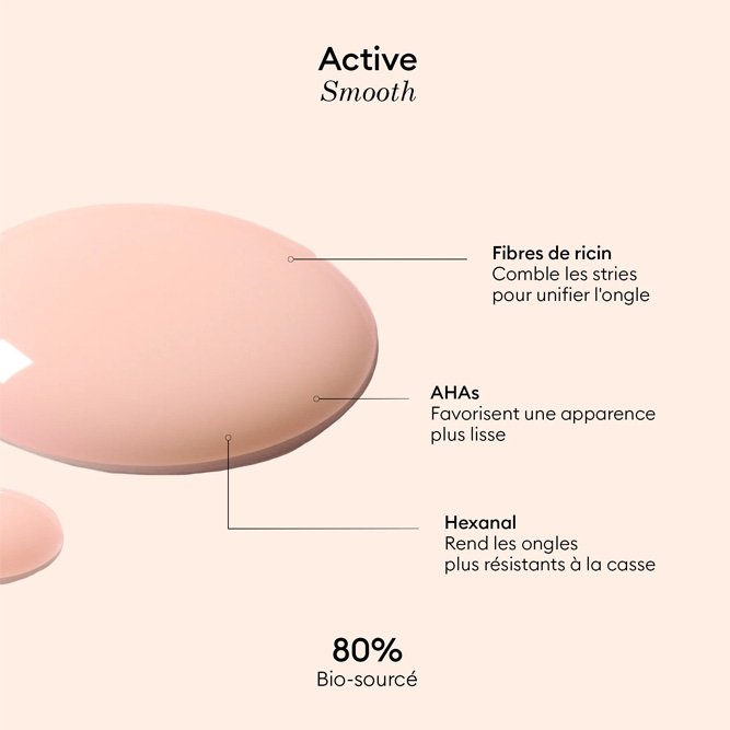 Illuminez et lissez naturellement vos ongles avec le active smooth bio-sourcé 80%. Ce perfecteur 2 en 1 enrichie en Hexanal, AHA et Vitamine E et fibres de ricin gomme les imperfections et stries de la surface de l’ongle pour un effet lissant. Sa couleur beige laisse un voile satiné sur vos ongles. Il n’est pas compatible avec la gamme Green Flash™ mais est parfait pour prendre soin de vos ongles entre deux poses.