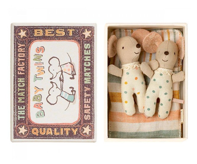 Découvrez les bébés souris jumeaux MAILEG vêtues d’un pyjama à pois et de leur couverture rayée. Ils sont parfaits pour jouer et imaginer un univers entier ! Jolis, vous pouvez aussi les collectionner avec sa petite boîte d’allumettes.