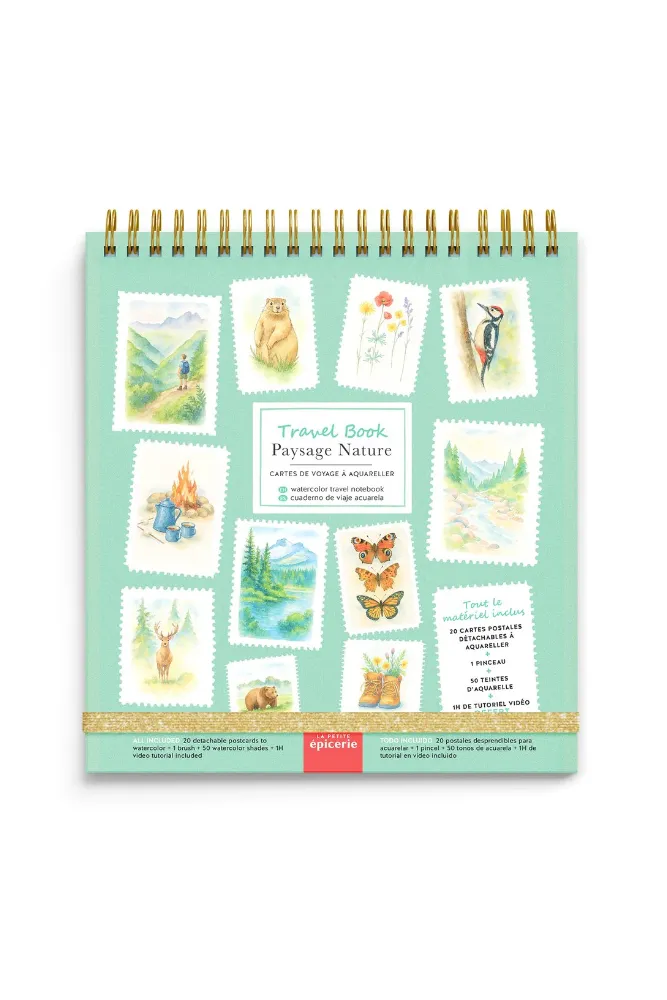 Reconnectez-vous à la nature avec le Travel Book – Paysage Nature de La Petite Épicerie. Ce carnet créatif vous propose 20 cartes postales à aquareller ou à colorier, inspirées de la faune et de la flore : forêts luxuriantes, montagnes majestueuses, rivières paisibles, fleurs sauvages et animaux.